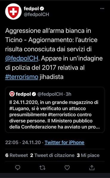 E' risultata legata al terrorismo jihadista la donna di 28 anni, cittadina svizzera, che ieri pomeriggio (martedì) intorno alle 14 è stata fermata dalla polizia cantonale a Lugano dopo aver aggredito armata di coltello due donne, ferendone una alla gola al quinto piano della Manor, un grande magazzino di piazza Dante.