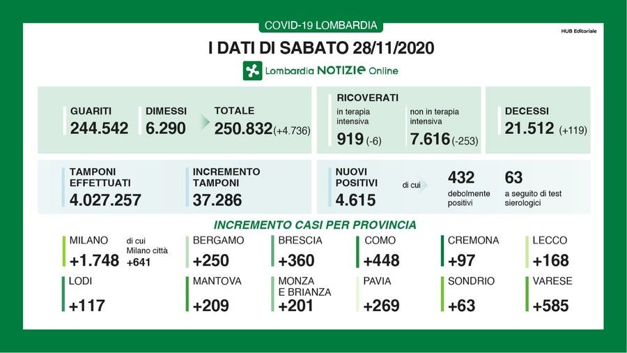 Ecco il quadro completo dei dati di oggi, sabato 28 novembre, in Lombardia e il dettaglio provincia per provincia.