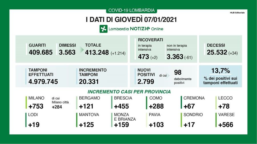 Ecco il quadro completo dei dati di oggi, giovedì 7 gennaio, in Lombardia e il dettaglio provincia per provincia. .