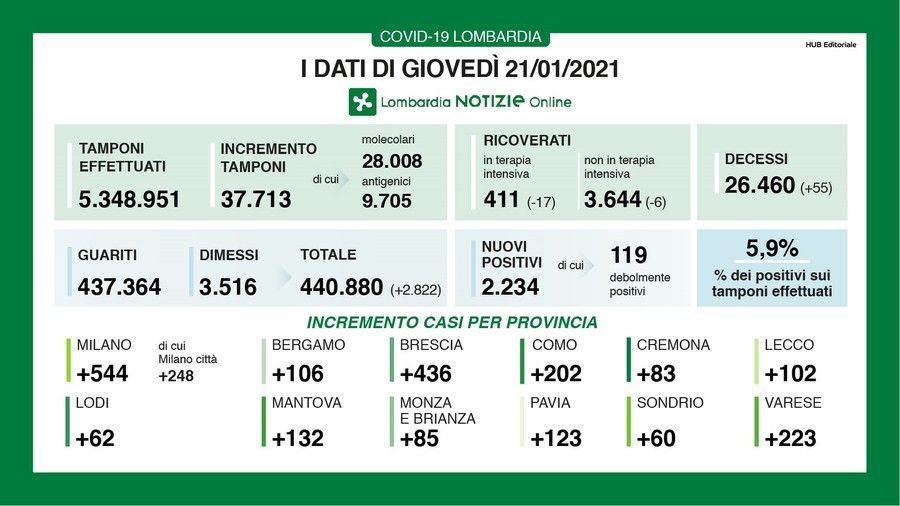 Ecco il quadro completo dei dati di oggi, giovedì 21 gennaio, in Lombardia e il dettaglio provincia per provincia.