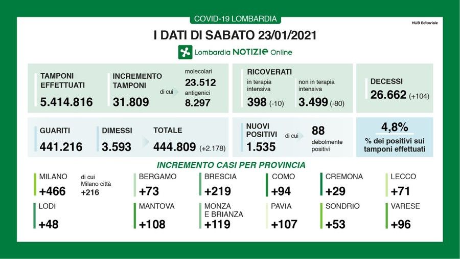 Ecco il quadro completo dei dati di oggi, sabato 23 gennaio, in Lombardia e il dettaglio provincia per provincia.
