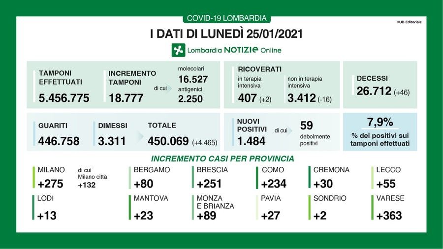 Ecco il quadro completo dei dati di oggi, lunedì 25 gennaio, in Lombardia e il dettaglio provincia per provincia.