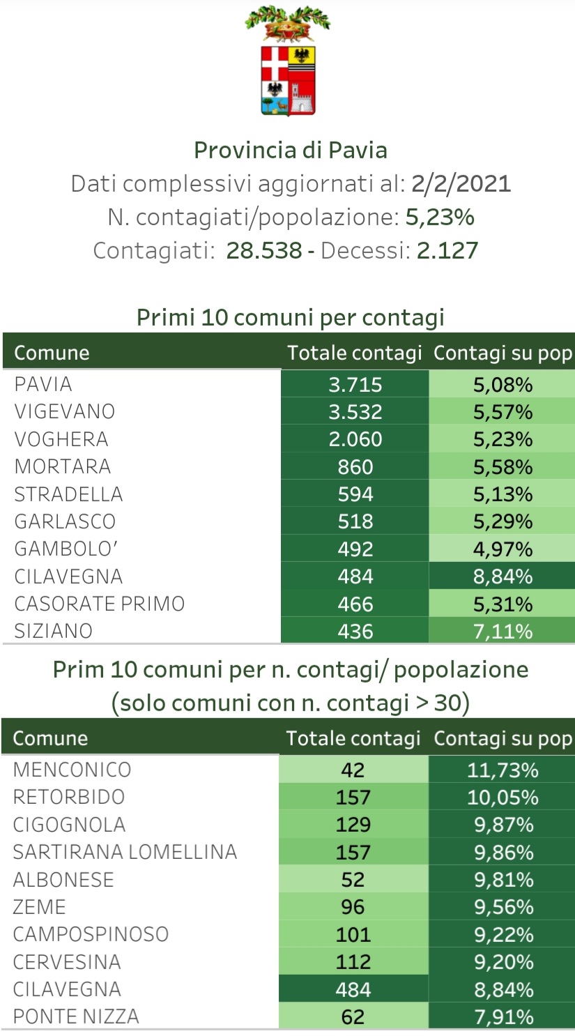 Covid-19, i comuni più colpiti in provincia di Pavia al 2 febbraio
