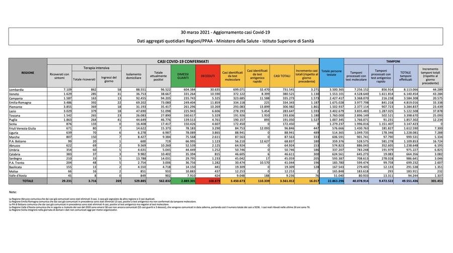 Questa invece la situazione nelle altre regioni: Piemonte +1.861, Lazio +1.593, Puglia +1.527, Emilia +1.187, Toscana +1.180, Veneto +1.130, Liguria +489, Friuli +447, Marche +333, Calabria +300, Sardegna +205, Prov. di Trento +196, Prov. di Bolzano +180, Abruzzo +153, Valle d'Aosta +134, Basilicata +128, Molise +2, Sicilia (non pervenuto)*