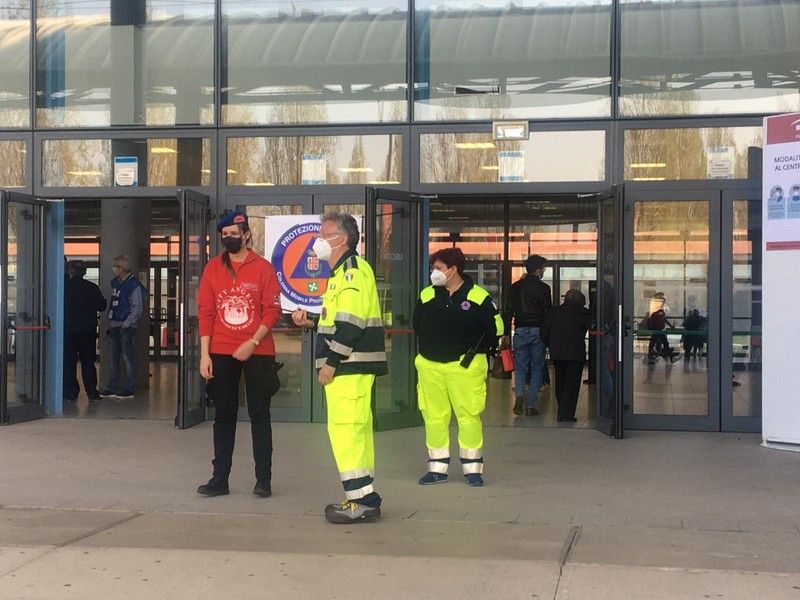I primi ultraottantenni si sono presentati all'ingresso, aiutati dal servizio d'ordine e dall'assistenza della Protezione civile, della Croce Rossa, dei City Angels e di tanti, tanti volontari che hanno permesso l'avvio dell'operazione in serenità e tranquillità.