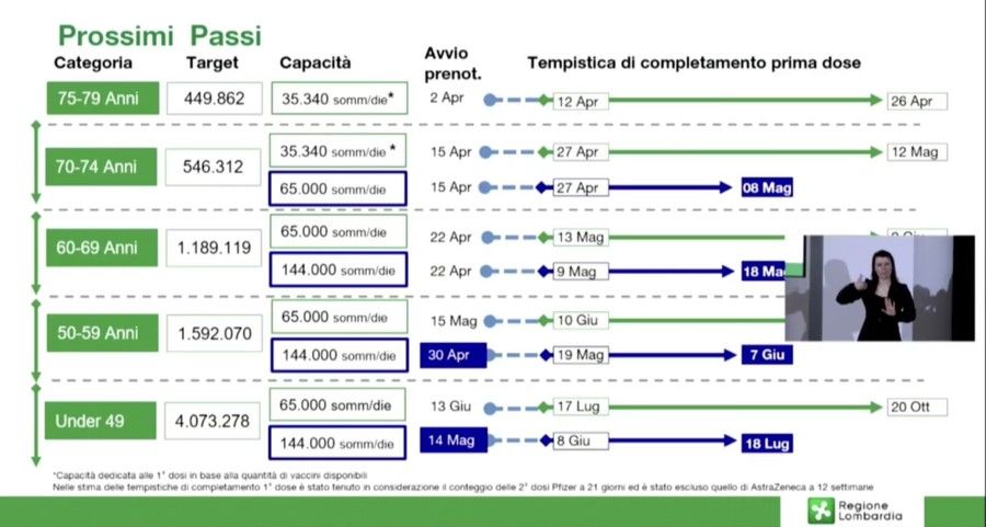 Una campagna di massa che partirà il 12 aprile, il giorno dopo la conclusione delle somministrazioni alle prime dosi agli over 80 lombardi e che avrà comunque criteri anagrafici: si comincerà quindi con la fascia compresa tra i 75 e i 79 anni, poi si passerà a classi di età in ordine decrescente fino ad arrivare ai più giovani. La previsione è che la classe di 75-79 (449.862 persone) riceverà la prima dose entro il 26 aprile, poi dal 27 aprile toccherà alle persone tra i 70 e i 74 anni (546mila persone) e via dicendo.