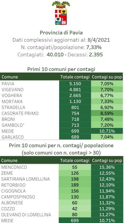 I contagi nei comuni del nostro territorio all'8 aprile: ecco quali sono ad oggi i dieci comuni con più contagi in provincia di Pavia, da inizio pandemia (febbraio 2020) e quelli con più contagi rispetto alla popolazione. Per ogni provincia il numero dei decessi. Dati forniti da Regione Lombardia