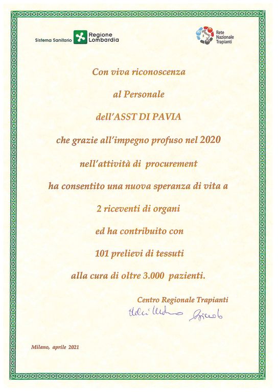 Il Centro Regionale Trapianti, per l’occasione, ha trasmesso una nota ufficiale alla Direzione Generale di ASST Pavia, ringraziando - a nome delle famiglie dei donatori deceduti e degli assistiti che hanno potuto beneficiare di un trapianto di organi e tessuti - tutto il personale aziendale coinvolto nel Procurement: “Con viva riconoscenza al Personale dell’ASST DI PAVIA, che grazie all’impegno profuso nel 2020 nell’attività di procurement ha consentito una nuova speranza di vita a 2 riceventi di organi ed ha contributo con 101 prelievi di tessuti alla cura di oltre 3.000 pazienti”