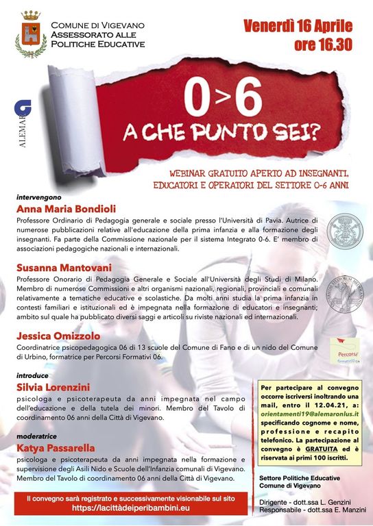 Pertanto, oltre al portale dedicato alla fascia di età ZeroSei consultabile online https://xn--lacittdeiperibambini-1wb.eu/ è prevista per il prossimo 16 aprile un’altra importante iniziativa, ovvero il Convegno “Zerosei a che punto sei?” con la presenza di esperti che fanno parte del Comitato Nazionale Ministeriale come la Dottoressa Mantovani e al Dottoressa Bondioli come meglio esplicitato nel volantino.