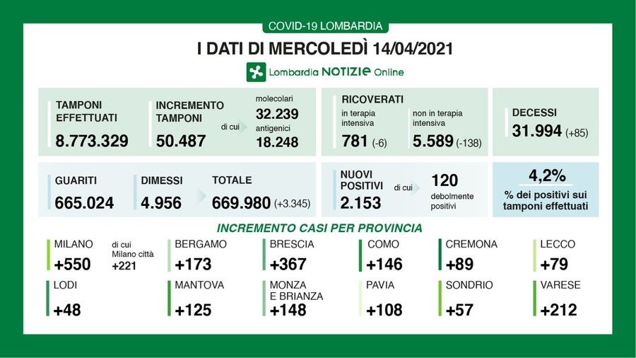 Ecco il quadro completo dei dati di oggi, mercoledì 14 aprile, in Lombardia e il dettaglio provincia per provincia.
