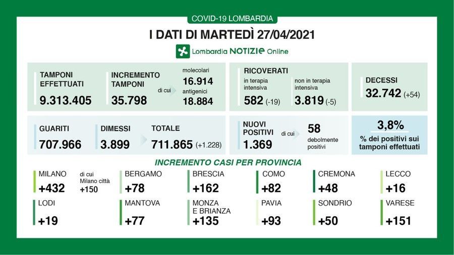 Ecco il quadro completo dei dati di oggi, martedì 16 aprile, in Lombardia e il dettaglio provincia per provincia.
