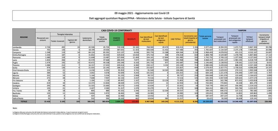 Ecco invece la situazione nelle altre regioni: Campania +1.233, Lazio +788, Toscana +713, Emilia +650, Puglia +646, Piemonte +592, Sicilia +494, Veneto +492, Calabria +312, Marche +250, Liguria +152, Abruzzo +145, Umbria +108, Basilicata +104, Friuli +68, Prov. di Bolzano +57, Prov. di Trento +57, Sardegna +54, Molise +18, Valle d'Aosta +8.