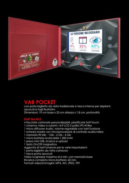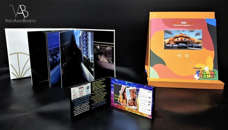 L’idea nasce nel 2018 come un progetto da materializzare; Fabrizio si rivolge quindi al mercato internazionale per conoscere i migliori produttori di microtecnologia Audio-Video, trovando una piccola e organizzatissima ditta produttrice di mini schermi multifunzionali LCD ad alte prestazioni, che aveva lavorato per grandi multinazionali di fama mondiale (The Walt Disney Company, Huawei, Coca-Cola, Zippo, P&G, Hallmark, Chanel, IBM, Mitsubishi, Casio TV) che si affida ad una ditta specializzata nella produzione di micro batterie ricaricabili ad alte prestazioni. Parlando con i vari ingegneri hardware/software e trattando con i vertici aziendali, dopo 2 anni e vari tentativi e rallentamenti dovuti alla pandemia Covid-19, prototipi funzionali e prove di qualità, Fabrizio ottiene finalmente un’ampia e completa gamma di prodotti per il Luxury World: il risultato finale è VAB (Video Audio Biglietto), realizzato in più varianti dimensionali e interattive, dal biglietto da visita fino alla cartellina (formato A4TOP folder), tutti interamente personalizzabili dalla struttura cartonata (chassis) con stampa quadricromatica su tutta la superficie e plastificazione soft-touch, con Video-Audio incorporato mostrato su mini-schermi LCD TFT o IPS.