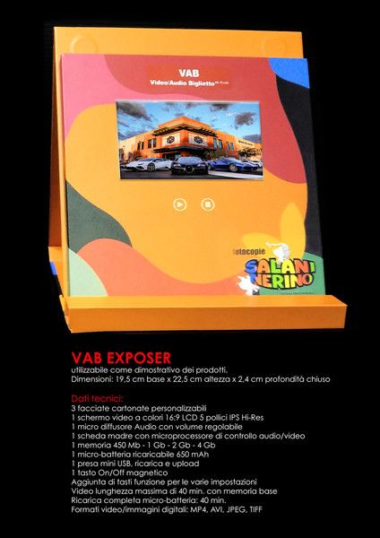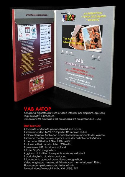 VAB è adatto per le presentazioni, le mostre, la realizzazione di cataloghi e manuali, per il lancio di nuovi prodotti e nuove campagne pubblicitarie, o ancora per realizzare biglietti di auguri personalizzati, per le conferenze e i meeting, in particolar modo per le professioni di nuova generazione e tutti gli eventi, le cerimonie, gli show commerciali che vengono organizzati sempre più frequentemente.