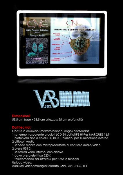 Infine, l’ultimo prodotto della gamma che Fabrizio è riuscito a realizzare, da lui stesso definito “il gioiellino”, è la VAB HOLOBOX 3D2, un display led box con schermo a colori LCD IPS Trasparente Marquee, dove i filmati esaltano gli oggetti esposti all'interno, presentato in esclusiva ed anteprima europea.