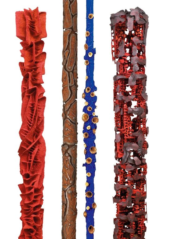Alfredo Mazzotta 'disegna' il volume nel bronzo con accortezza estrema, inseguendo nel tempo, con determinata volontà espressiva, quella che potremmo definire la sua personale ricerca della perfezione; la raggiunge predisponendo una scandita successione di soggetti plastici contrassegnati dall'indipendenza espressiva della propria vita interna, per poi tornare ad essere collegati tra di loro attraverso il fil rouge della 'volontà di ricerca'. Dal singolo al collettivo, dalla forza che si esercita su se stessa, alla processualità che si distende per capitoli, lo 'sguardo' e il 'consumo' del fruitore dell'arte sosta e avanza, si sofferma e si concentra sullo sviluppo di una curva, penetra il varco della materia accuratamente patinata, spesso arretra per re-inquadrare, sospinto dal desiderio di 'accarezzare', per poi trovare la strada che lo conduce al rapporto di continuità espositiva affascinato dall'infinito. Ho sempre pensato che Armanda Verdirame si offre e si dedica alla 'terra' - forse - con il desiderio di fornirle la possibilità di auto-esprimersi, di manifestare a lei stessa e quindi a noi attraverso le sue opere dopo la cottura, il segreto che in essa si cela; solo il connubio perfetto tra l'esperienza e la sensibilità, tra 'affondo' tattile nella materia ed 'estrazione' da essa del 'messaggio', si manifesta pienamente con variabili imprevedibili, la trascrizione di quel racconto che appartiene alle 'origini' del Pianeta. La scultura risponde alla 'parola' del rotolo, si sviluppa ruotando su se stessa, pronta ad ospitato la scrittura'cuneiforme', per poi disporsi alla decifrazione dello sguardo; la verticalità impressa alla stratificazione orizzontale della terra, manifesta la volontà 'estrattiva' del raccontare,a cui fa seguito l'incontro tra le origini, mai statiche, della materia con la storia della civiltà umana e con la sua irrefrenabile evoluzione: sono Colonne che reggono, si iscrivono e si impongono nel tempo, avvolte da un bellico-frastornato silenzio.