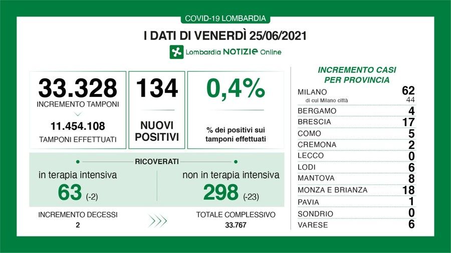 In Lombardia i casi registrati oggi sono 134 sulla base di 33.328 tamponi totali analizzati (0.4 %, nessun contagio nelle province di Sondrio e Lecco). Ieri sul nostro territorio regionale l'incremento di positivi era stato di 155 contagi con 32.837 tamponi totali, l'altro ieri invece di 131 a fronte di 32.980 tamponi.