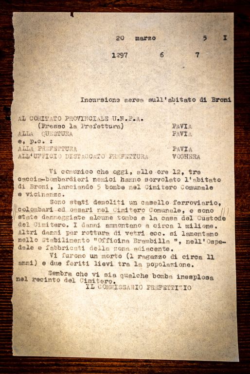 «Da studiare e valorizzare con attenzione – aggiungono le archiviste - è poi la sezione Novecentesca dell'Archivio Storico, a causa delle vicende che hanno coinvolto la città a seguito della collocazione della sede della Sicherheits presso Villa Nuova Italia e l'occupazione del Castello di Cigognola. Si conservano gli elenchi dei prigionieri e degli internati di guerra e un elenco riportante i provvedimenti assistenziali adottati a favore dei congiunti. Sono state reperite inoltre le fotografie dei bronesi facenti parte del Corpo dei Volontari per la Libertà e caduti nel corso dei venti terribili mesi seguiti all'Armistizio del settembre 1943. Numerosi dattiloscritti sono relativi ai ripetuti bombardamenti che colpirono Broni durante la Seconda Guerra Mondiale, dei quali si trova precisa traccia nel diario dell'allora parroco monsignor De Tommasi, “Dieci mesi d'inferno”. Nel documento proposto, del 20 marzo 1945, si dà notizia di bombe lanciate nei dintorni del Cimitero cittadino».