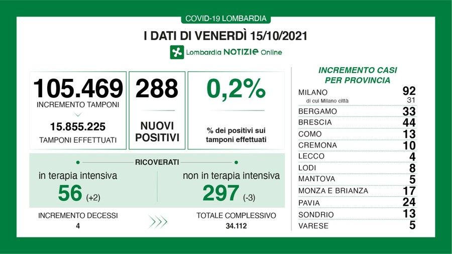 In Lombardia i nuovi positivi registrati oggi sono 288 sulla base di 105.469 tamponi totali analizzati (percentuale 0,2%). Ieri sul nostro territorio regionale l'incremento era stato di 273 casi con 66.424 tamponi totali, l'altro ieri invece di 307 a fronte di 53.236 tamponi.