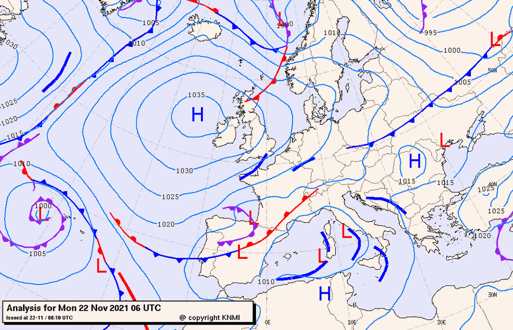 La fascia di alta pressione, presente sull'Europa, si ritira verso le Isole Britanniche, favorendo dapprima la formazione di una canale depressionario e successivamente di un minimo ciclonico sull'Italia. Ne conseguirà una fase piovosa fino alla prima parte di Martedì, mentre un breve intervallo di variabilità avrà luogo con Mercoledì.