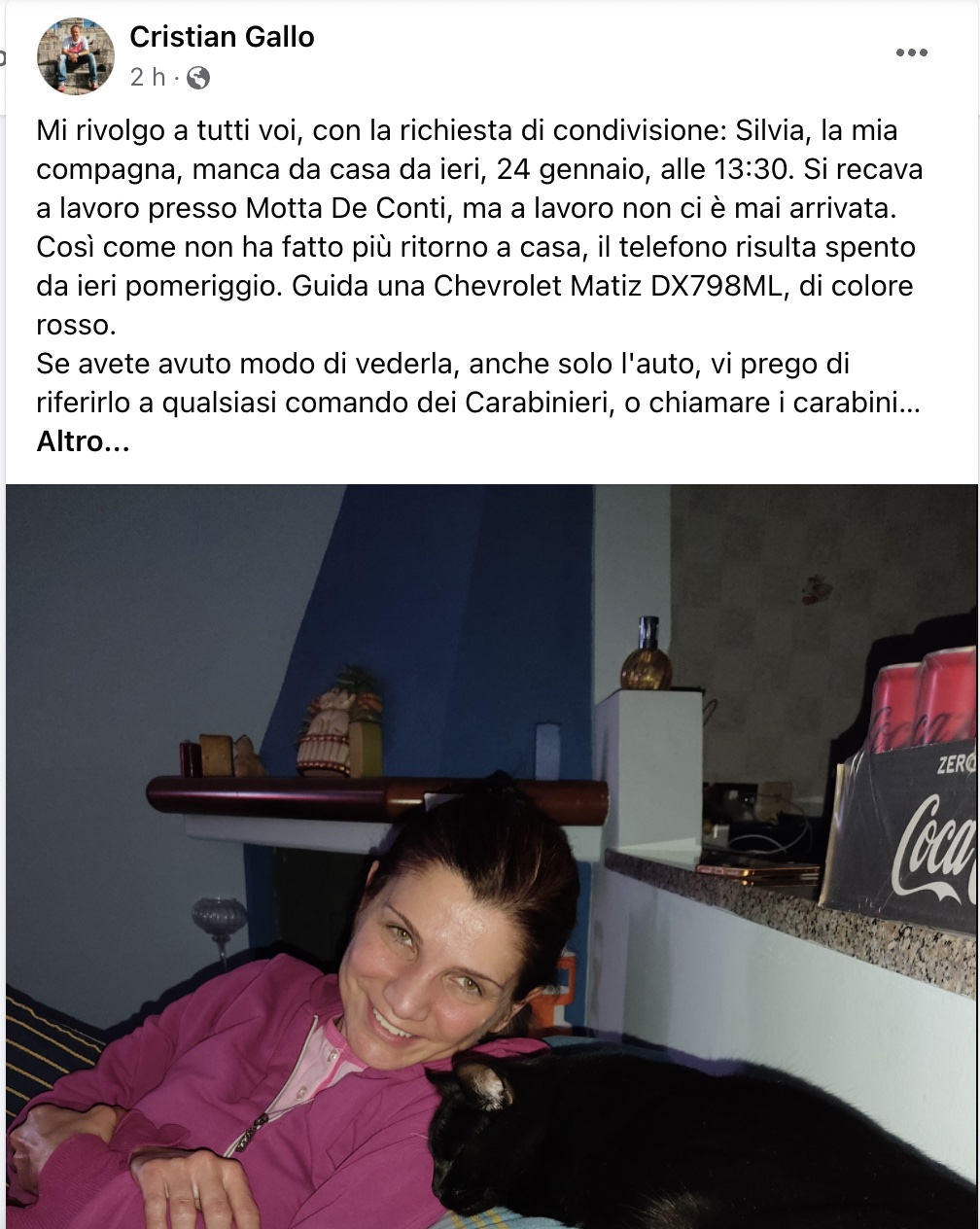 Moltissime anche le persone che, in queste ore, stanno lasciando messaggi di cordoglio al compagno della donna, il livornese Cristian Gallo che, in giornata, aveva chiesto l'aiuto di tutti per cercare di rintracciare la donna, della quale si erano perse le tracce nella giornata di lunedì, quando era uscita di casa per andare al lavoro.
