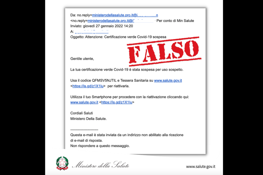 “Se hai ricevuto un'email con oggetto 'Attenzione: Certificazione verde Covid-19 sospesa', inviata da ministerodellasalute.pro.it -prosegue il testo dell'avviso ai cittadini italiani-, non proviene dal Ministero della Salute, ma si tratta di un tentativo di phishing” ovvero “un tipo di truffa effettuata su Internet attraverso la quale malintenzionati cercano di ingannare la vittima convincendola a fornire informazioni personali per farne un uso improprio”.