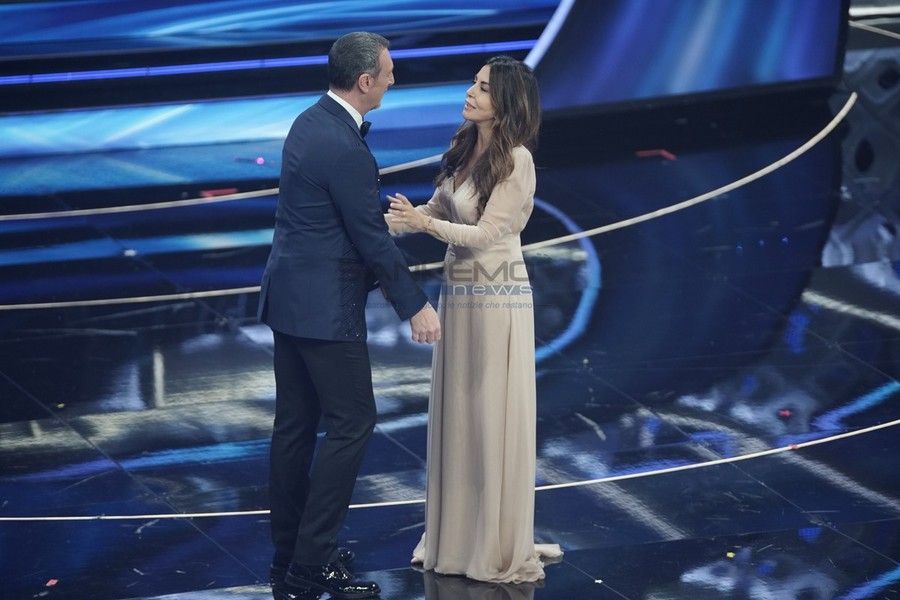 Subito travolgente Sabrina Ferilli, che affianca Amadeus nella conduzione della finalissima di Sanremo 2022.