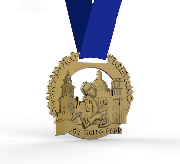 A meno di un mese è tempo di presentare la medaglia celebrativa dell'evento, uno dei gadget più apprezzati dagli atleti, proprio perché ne attesta la partecipazione e suggella l'impresa. Si tratta di una medaglia tonda del diametro di 60 mm, in lega di zama e prodotta dalla ditta Dal Mas, che riprende sul fronte il logo della manifestazione, con Mr. Scarpadoro che corre sorridente tra cupole, torri e campanili di Piazza Ducale, e sul retro la tanto agognata scritta ‘Finisher’. Purtroppo, le normative anti Covid non permettono ancora di poterla mettere direttamente al collo degli atleti, ma di farla trovare nel ‘sacchetto ristoro’.