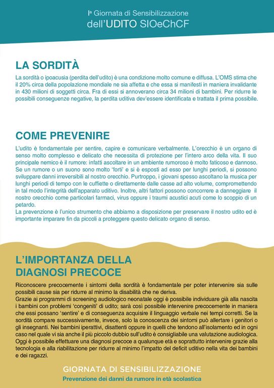 L'evento rappresenta uno screening per gli studenti che lo richiedano, in quanto portatori di disturbi uditivi di recente insorgenza, oppure perché abitualmente esposti all’ascolto di musica ad elevati livelli di volume. Le evidenze clinico/scientifiche ci insegnano che l’ascolto prolungato ad alto volume di musica con lo smartphone o altri dispositivi di riproduzione possono determinare danni permanenti alla funzione uditiva. La precoce identificazione di questi casi avrebbe sia un valore diagnostico, sia preventivo, potendo promuovere differenti e più sane abitudini di ascolto. Aderiranno alla giornata molti reparti ospedalieri e universitari oltre a numerose postazioni ambulatoriali territoriali del SSN e strutture specialistiche private. Per questa iniziativa sono stati chiesti il patrocinio del Ministero della Salute, l’Alto Patronato del Presidente della Repubblica nonché il patrocinio del Ministero della Pubblica Istruzione e della Federazione Nazionale dell’ordine dei Medici e degli Odontoiatri (FNOMCEO). I reparti di Otorinolaringoiatria degli Ospedali di Voghera e Vigevano parteciperanno alla giornata, prevedendo esami dell'udito gratuiti per i ragazzi dai 6 ai 18 anni.