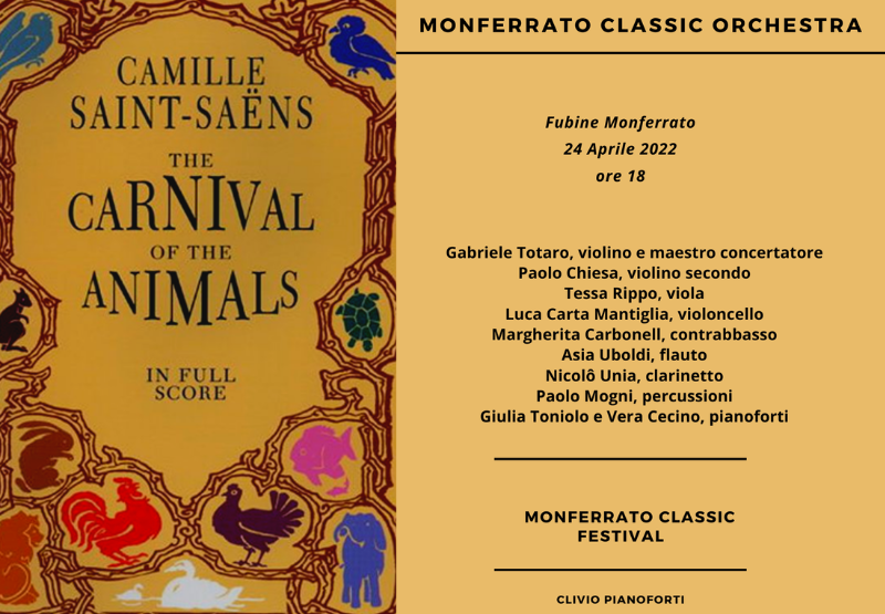 Una vera e propria galleria di animali, 14 brani complessi interpretati da fuoriclasse della Monferrato Classic Orchestra che renderanno speciale la prossima domenica pomeriggio nel Salone Bricherasio. Il concerto inizierà alle ore 18 e vedrá anche la presenza di un attore professionista,il casalese Fabio Fazi.