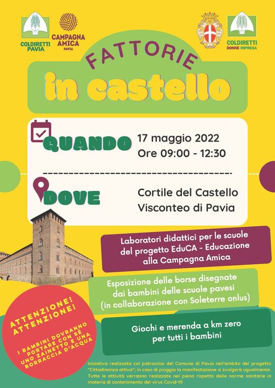 Nella mattinata di martedì 17 maggio 2022 tutti gli studenti delle scuole pavesi che hanno seguito in classe le lezioni degli esperti e degli agricoltori Coldiretti sulle attività agricole del nostro territorio si ritroveranno nel cortile del Castello Visconteo di Pavia. Qui, dalle 9 alle 12.30 circa, si svolgerà la festa conclusiva che ha ricevuto anche il patrocinio del Comune di Pavia. Alla festa nel cortile del Castello saranno invitate le classi delle scuole di Pavia che hanno partecipato al Progetto EduCa, che fa parte dell’iniziativa “Cittadinanza Attiva” promossa e sostenuta dall’Assessorato all’Istruzione e Politiche Giovanili del Comune di Pavia durante l'anno scolastico 2021/22.