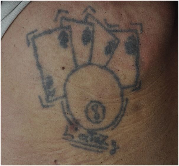 Pubblicati anche un particolare del tatuaggio sulla schiena che rappresenta quattro carte da gioco, una palla con numero 8 e scritta “L’exTuZg”, un particolare del tatuaggio interno polso con simbolo “infinito”, stella scritta “HAYAT” e cuore, un particolare del tatuaggio sulla coscia, verosimilmente una corona e la scritta “King”.