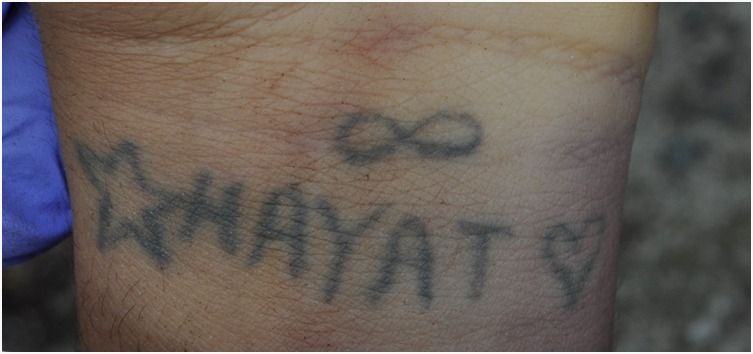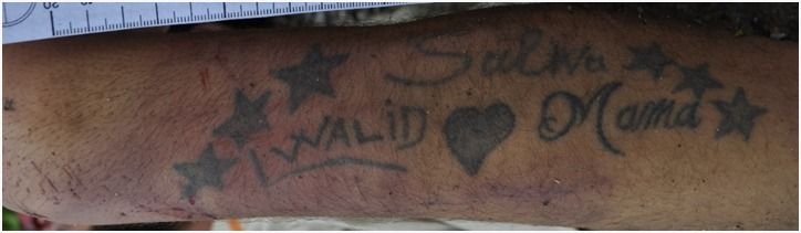 Il cadavere presenta un tatuaggio sull’avambraccio sinistro, oltre a stelle e cuore, le scritte “I WALID Mama e presumibilmente “Salwa” e un tatuaggio sul basso ventre presenta tre stelle ed una scritta “Prinse” con “simbolo infinito”.
