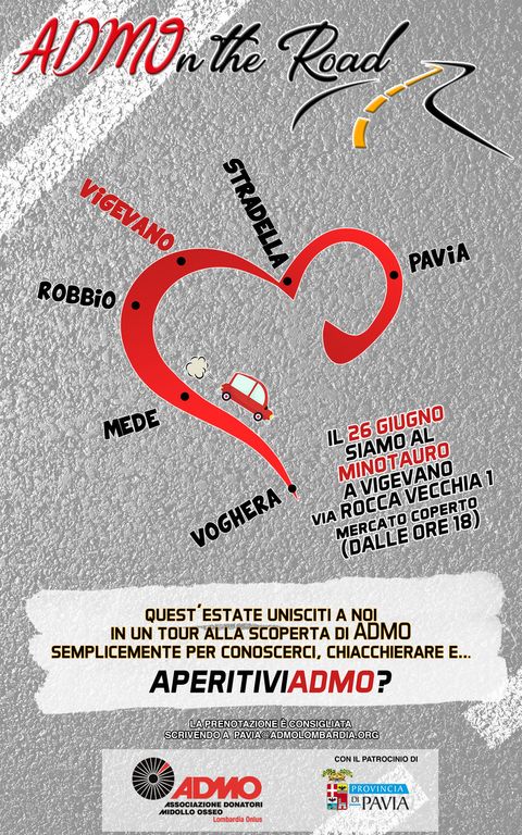 "Quest'anno stiamo organizzando un evento itinerante in diversi comuni della provincia, patrocinato dalla provincia stessa, che ha come obiettivo la sensibilizzazione della cittadinanza sul tema della donazione e il reclutamento di nuovi volontari. Si chiama "ADMOn the Road" ed è articolato in una serie di aperitivi informativi presso i locali che intendono aderire, da aprile a settembre 2022.