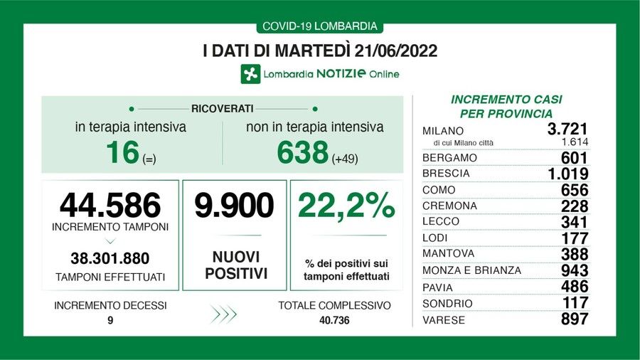 In Lombardia i positivi registrati oggi sono 9.900 a fronte di 44.586 tamponi effettuati. Ieri sul nostro territorio regionale l'incremento era stato di 1.920 casi con 10.553 tamponi totali.