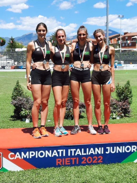 In prima frazione viene schierata (causa assenza di Arianna Gavuglio) la velocista Bianca Moretti che non aveva mai corso un 400m, ma i tecnici erano certi che poteva fare bene, ed infatti grande prima frazione per Bianca che cambia al terzo posto, seconda frazione per Susanna Caronti di grande qualità e grinta e chiude cambiando già in seconda posizione, Susanna ormai ha la piena consapevolezza dei suoi mezzi ed è al primo anno di categoria, in terza frazione (anche lei al primo anno di categoria) ecco Arianna Frigatti che ha il compito non facile di contenere anche l’eventuale rientro della squadra dietro, Arianna non molla un centimetro e porge il testimone a Ludovica Pilla che non sembra risentire della grande finale appena corsa e va all’inseguimento della Bracco, non riesce aveva la campionessa italiana, ma chiude la gara con il grande tempo e la medaglia d’argento per una formazione che ha fatto emozionare tutti e orgogliosi di queste ragazze che hanno un sicuro futuro.