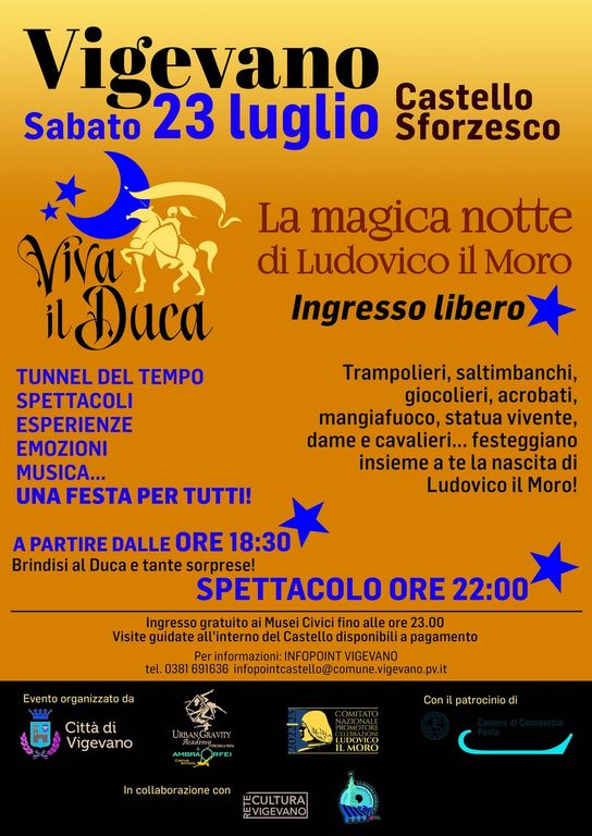 Quest’anno il 23 LUGLIO si terrà la prima edizione de “VIVA IL DUCA – La magica notte di Ludovico il Moro” con tante sorprese e spettacoli gratuiti organizzati dal Comune di Vigevano e Urban Gravity Academy & Ambra Orfei Circus School con la collaborazione di Rete Cultura e il Distretto del Commercio.