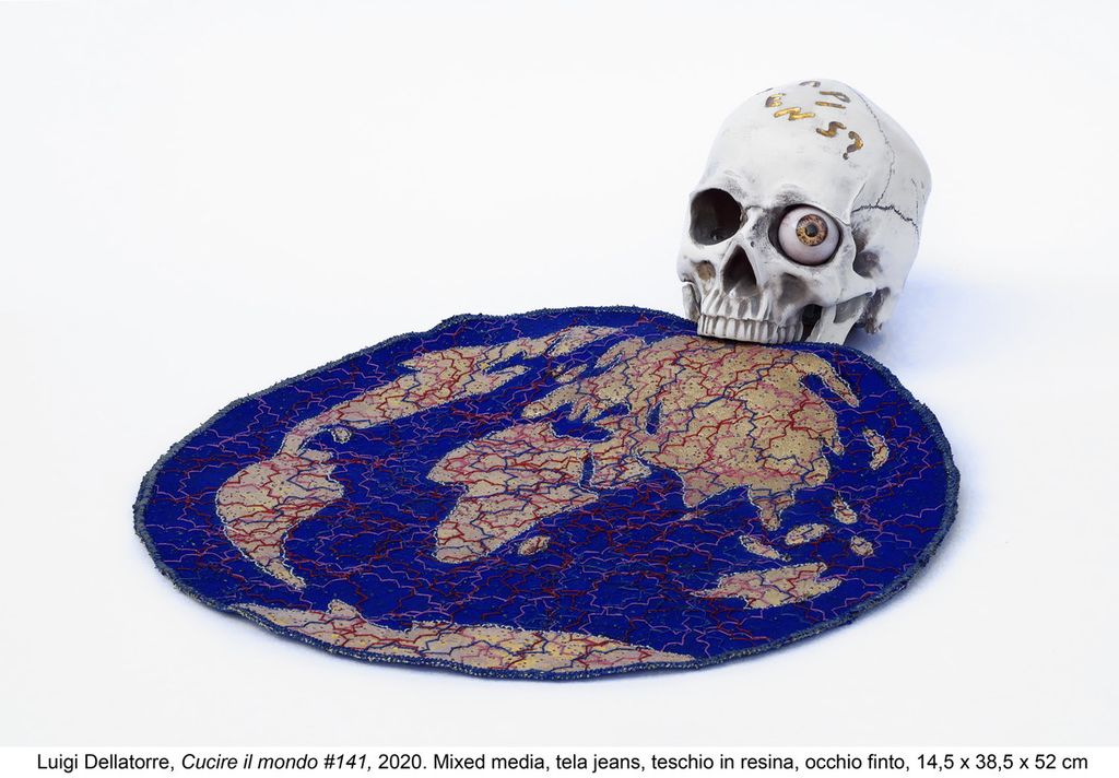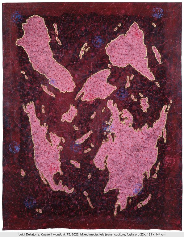 La mostra presenta alcune delle opere recenti del ciclo Cucire il mondo: improbabili cartografie del globo e mappe di continenti fantastici alla deriva, dove la grossolana tela di jeans, cucita minuziosamente ed a tratti dipinta, perde ogni connotato della sua identità d’origine per trasformarsi in spazio intellettuale colmo di riferimenti e denunce.