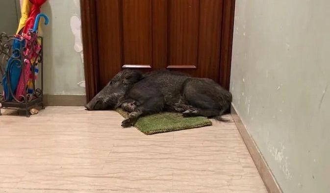 Invece, il cinghiale che sonnecchiava “beatamente” era veramente sdraiato sullo zerbino gettando il panico tra i residenti del condominio.