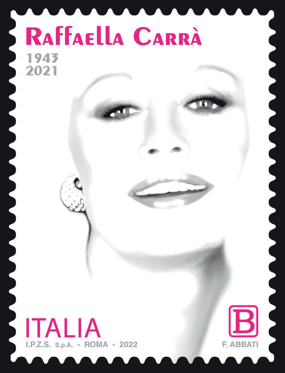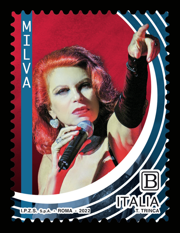 Completano i francobolli le legende “LINA WERTMÜLLER” “1928 - 2021”, “RAFFAELLA CARRÀ” “1943 2021”, “FRANCO BATTIATO”, “MILVA”, “CARLA FRACCI” “1936 - 2021” e “MONICA VITTI” “1931 - 2022”, la scritta “ITALIA” e l’indicazione tariffaria “B”.