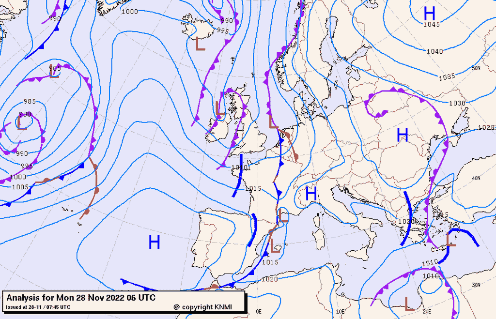La circolazione su scala Europea è governata da due figure di alta pressione centrate sull’estremo est del continente e al largo della penisola Iberica. Il Mediterraneo si trova nel mezzo di queste strutture anticicloniche con l’afflusso di aria fresca che alimenterà la persistenza di figure depressionarie anche nei prossimi giorni.
