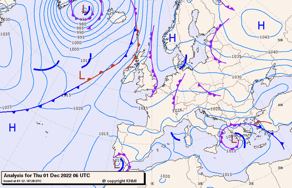 La circolazione su scala Europea è governata da due figure di alta pressione centrate sull’estremo est del continente e al largo della penisola Iberica. Il Mediterraneo si trova nel mezzo di queste strutture anticicloniche con l’afflusso di aria fresca che continua ad alimentare la persistenza di figure depressionarie.