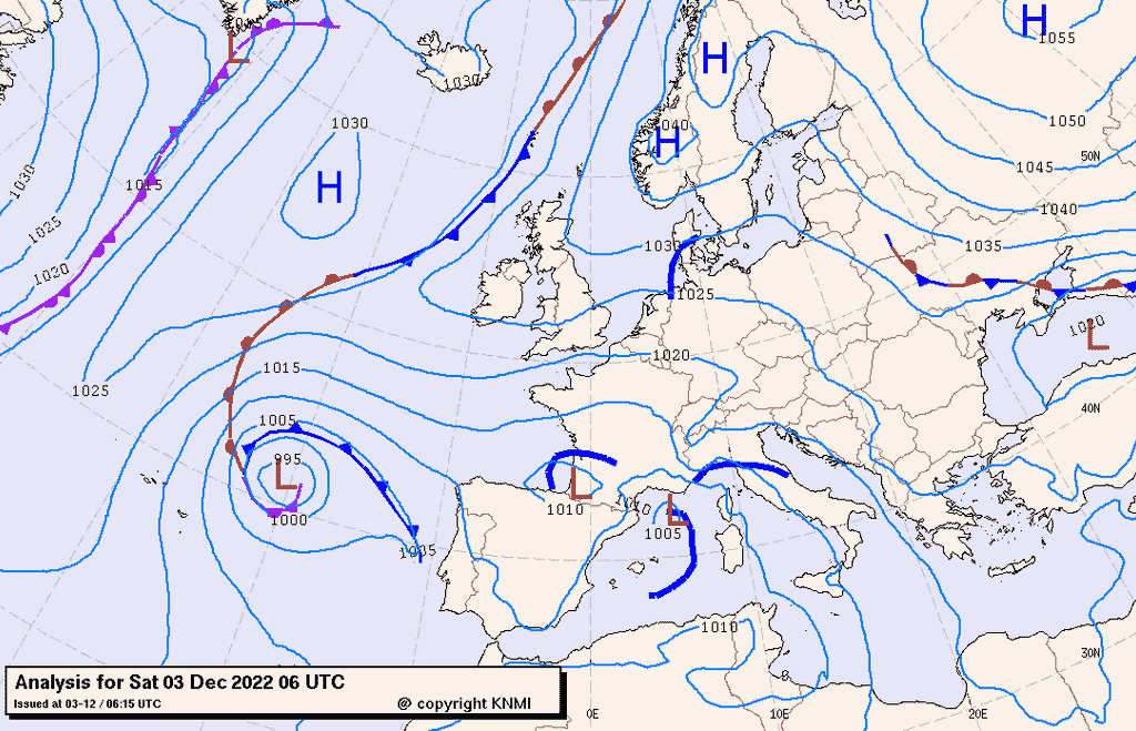 La circolazione su scala Europea è governata da due figure di alta pressione centrate sull’estremo est del continente e al largo della penisola Iberica. Il Mediterraneo si trova nel mezzo di queste strutture anticicloniche con l’afflusso di aria fresca che continua ad alimentare la persistenza di figure depressionarie.