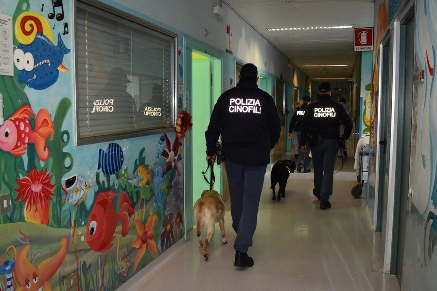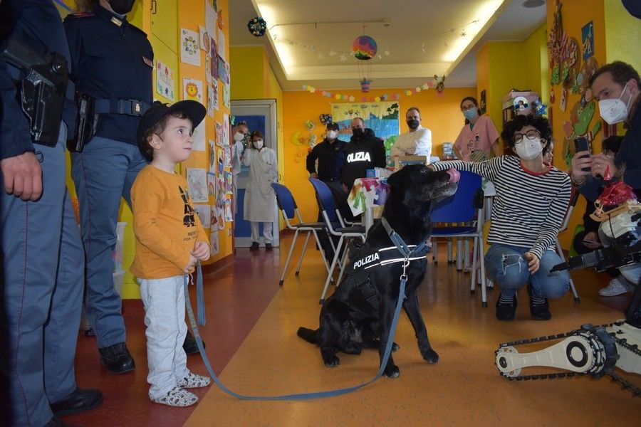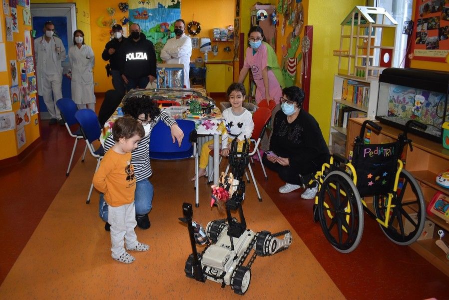 Il personale sanitario così come i visitatori del reparto di pediatria hanno potuto vivere insieme ai bambini ricoverati di un momento di spensieratezza ed allegria oltre che di notevole interesse per la visita che ha visto coinvolti due cani dell’Unità cinofila e delle apparecchiature, tra cui un robot, utilizzati dagli specialisti artificieri nella quotidiana attività di ricerca di esplosivi e ordigni.
