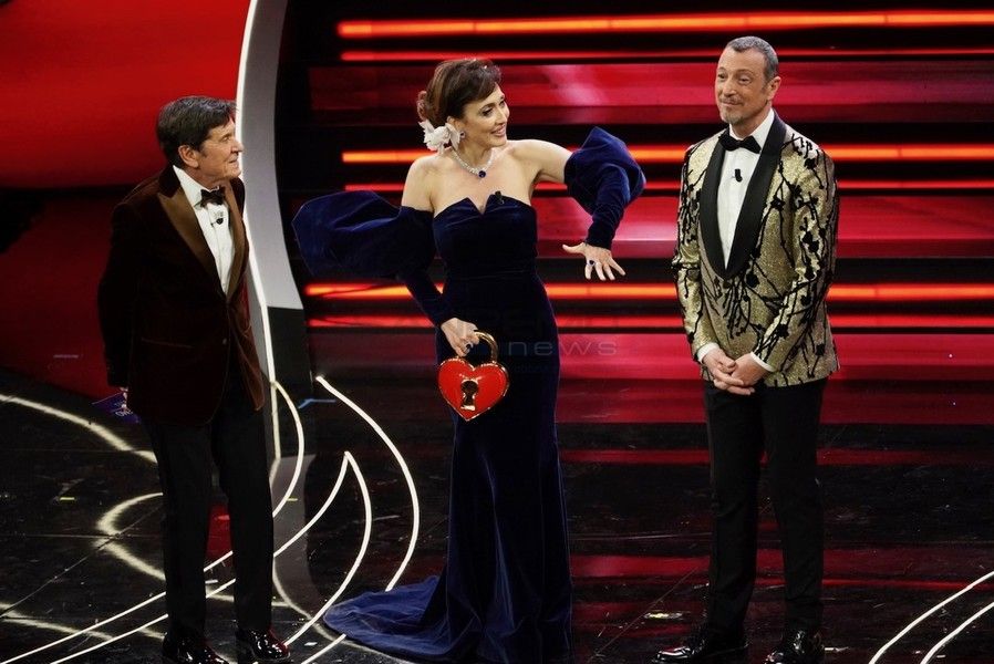 L'attrice che co-conduce la quarta serata insieme a Morandi e Amadeus anziché scendere le scale è apparsa tra il pubblico.