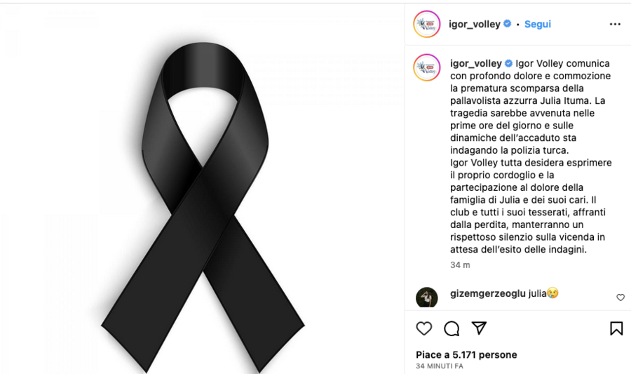 "Con profondo dolore e commozione la prematura scomparsa della pallavolista azzurra Julia Ituma. La tragedia sarebbe avvenuta nelle prime ore del giorno e sulle dinamiche dell’accaduto sta indagando la polizia turca".