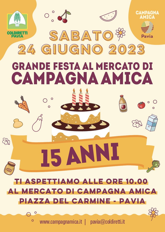 Una grande festa di compleanno in piazza per celebrare il “veterano” dei mercati agricoli di Coldiretti e Campagna Amica in provincia di Pavia. L’appuntamento è per sabato 24 giugno in piazza del Carmine a Pavia dove, a partire dalle ore 10.00, si festeggeranno i 15 anni del Mercato di Campagna Amica. Qui si ritroveranno agricoltori, cittadini e istituzioni per celebrare il primo mercato degli agricoltori pavesi, inaugurato nel 2008 e che negli anni è diventato un luogo di incontro e di socialità, oltre che un punto di riferimento per la città.