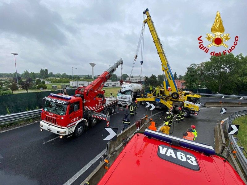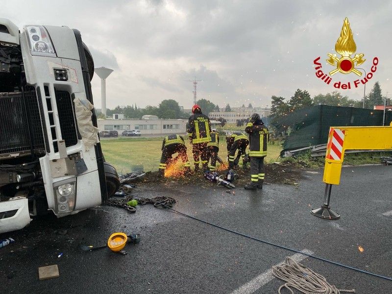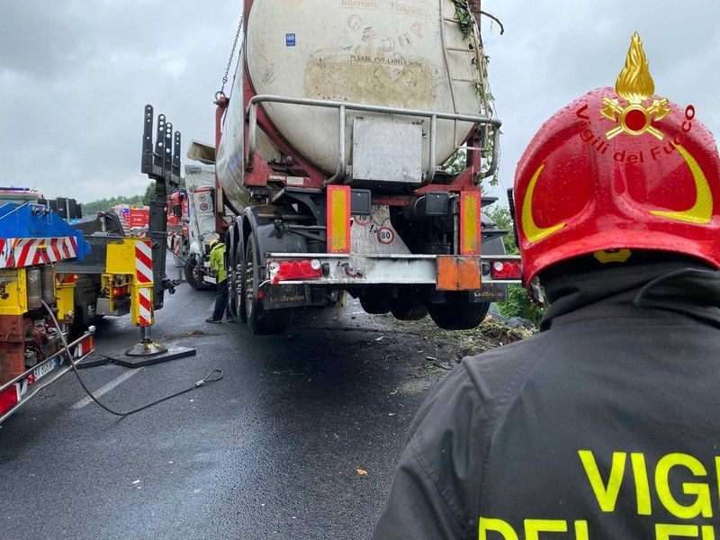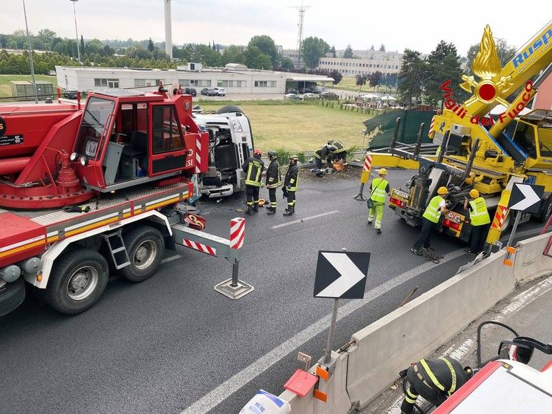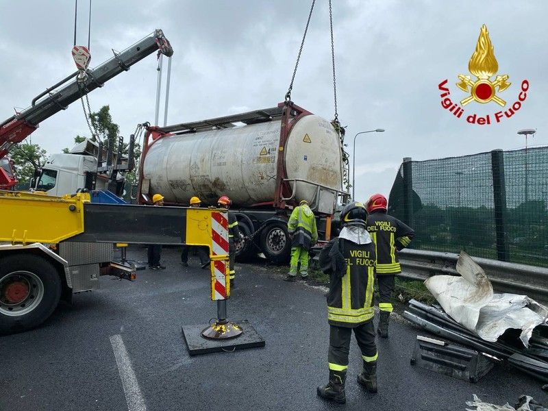 Attualmente il raccordo è ancora chiuso in entrambi i sensi di marcia al fine di permettere le operazioni di ripristino. Nell'incidente, che si era verificato intorno alle 11, era rimasto lievemente ferito il conducente del camion.