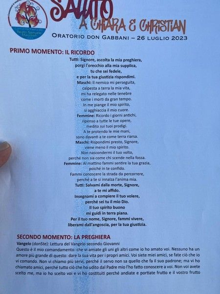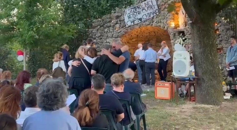 Il rosario, "Il pescatore" di De Andrè - una canzone che è un inno alla carità e che non aiuta le lacrime a fermarsi, ma quasi le invoca - gli amici chiamati vicino all’altare a mettere il nome sui palloncini da mandare in cielo per farli arrivare fino a lassù dove, mano nella mano, Chiara e Christian li aspettano, spinti dal cuore di tutti per farli salire. Innalzati da questo dolore devastante e dalla vicinanza di un'intera comunità che il papà di Chiara, Ignazio, sostenuto da molti ex colleghi della polizia locale, ha racchiuso in un gesto disperatamente affettuoso, riprendendo in un video tutti i presenti durante la canzone di De Andrè, come a voler tenere dentro almeno il ricordo di tutto questo amore per la figlia e per Christian.