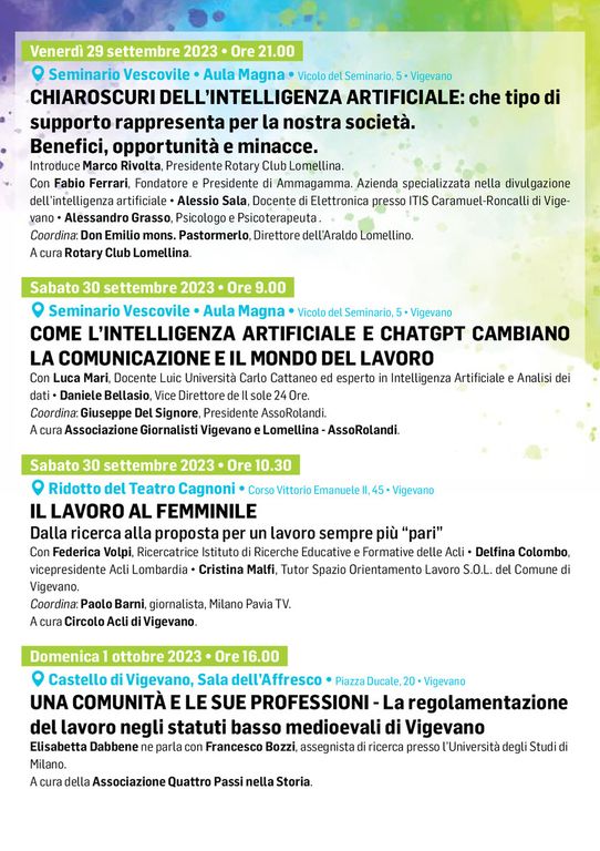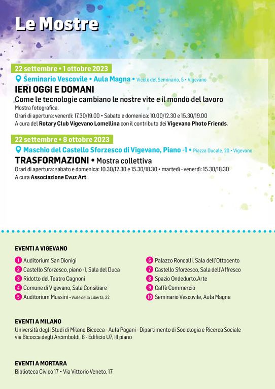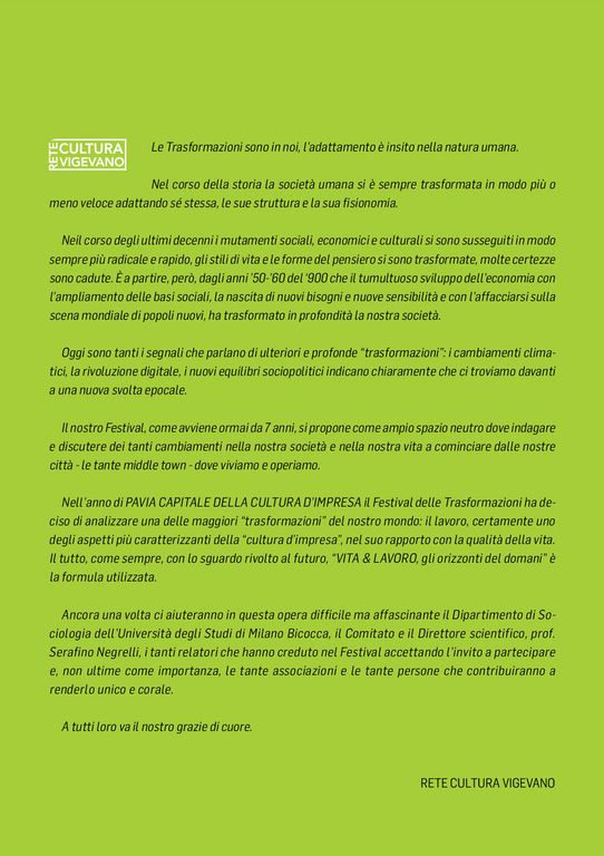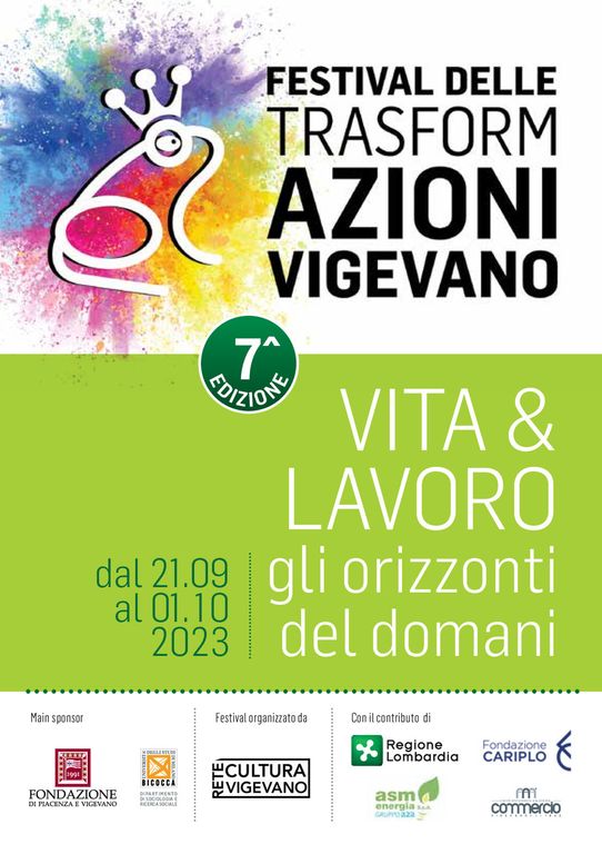 Rete Cultura Vigevano, punto di incontro tra le Associazioni Culturali vigevanesi, presenta la settima edizione del Festival delle Trasformazioni, un percorso di eventi, dibattiti e mostre che quest’anno avrà come focus il tema “VITA & LAVORO – gli orizzonti del domani”.
